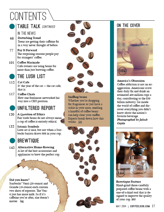 Our website, CoffeeLush.com, supplements readers’ coffee cravings by offering a variety of digital story packages. Readers will find brew blogs, how-to videos, multimedia reporting and photo stories and galleries. Through our user-friendly website, we seek to not only inform readers, but also to entertain them and offer them an interactive venue where they can voice their opinions.
